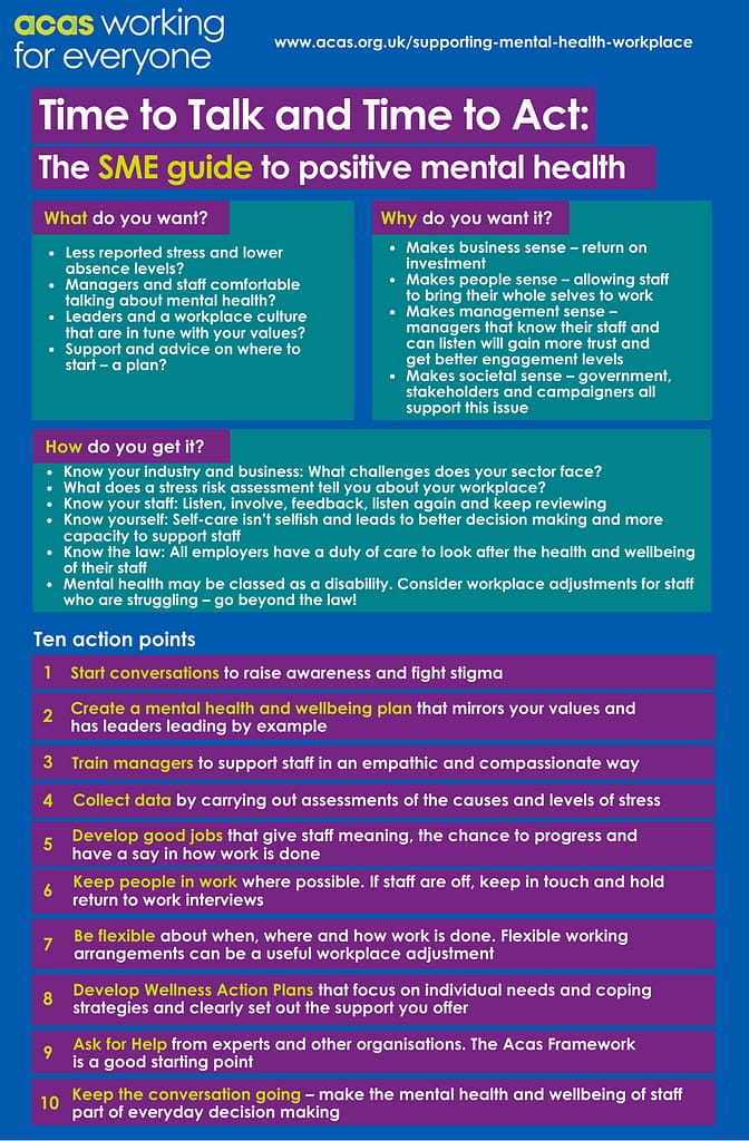 To find out more, the ACAS framework for positive mental health at work is available here, and the guidance on creating a supportive work environment is available here.