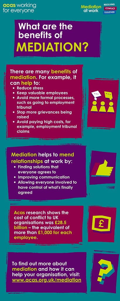 Workplace conflicts cost UK employers £28.5 billion each year, an average of over £1,000 for every employee. Many of these conflicts can be resolved earlier through informal, early dispute resolution such as mediation.